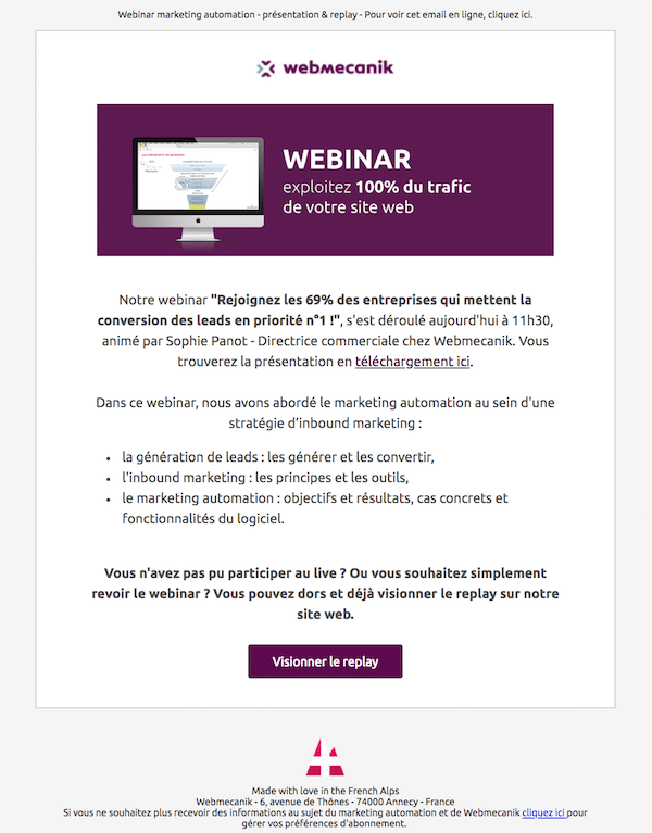 Comme dans l’exemple ci-dessous, vous pouvez voir qu’il y a un premier lien vers la ressource à télécharger et le second lien offre une 2ème opportunité de conversion avec plus de valeur puisqu’il permet de visionner le webinar en replay. Cette double conversion permet de faire avancer le lead un peu plus loin dans le cycle d’achat.