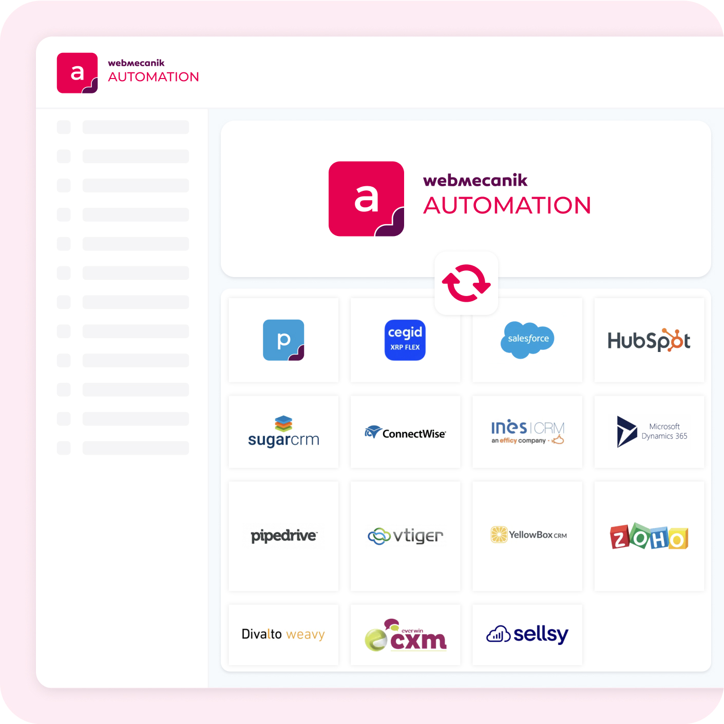 Webmecanik Automation propose des intégrations natives avec Cegid XRP Flex et Salesforce pour synchroniser toutes vos données. Vous pouvez également connecter d’autres plateformes, comme Magento, Shopify, WooCommerce ou Prestashop, via le connecteur tiers Zapier.