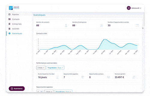 Les statistiques de Webmecanik Pipeline sont là pour éclairer vos performances. Suivez vos opportunités, vos gains prévisionnels et évaluez les performances commerciales de manière intuitive. Mesurez également l’activité des commerciaux et la répartition des tâches pour une gestion optimisée et des décisions stratégiques éclairées.