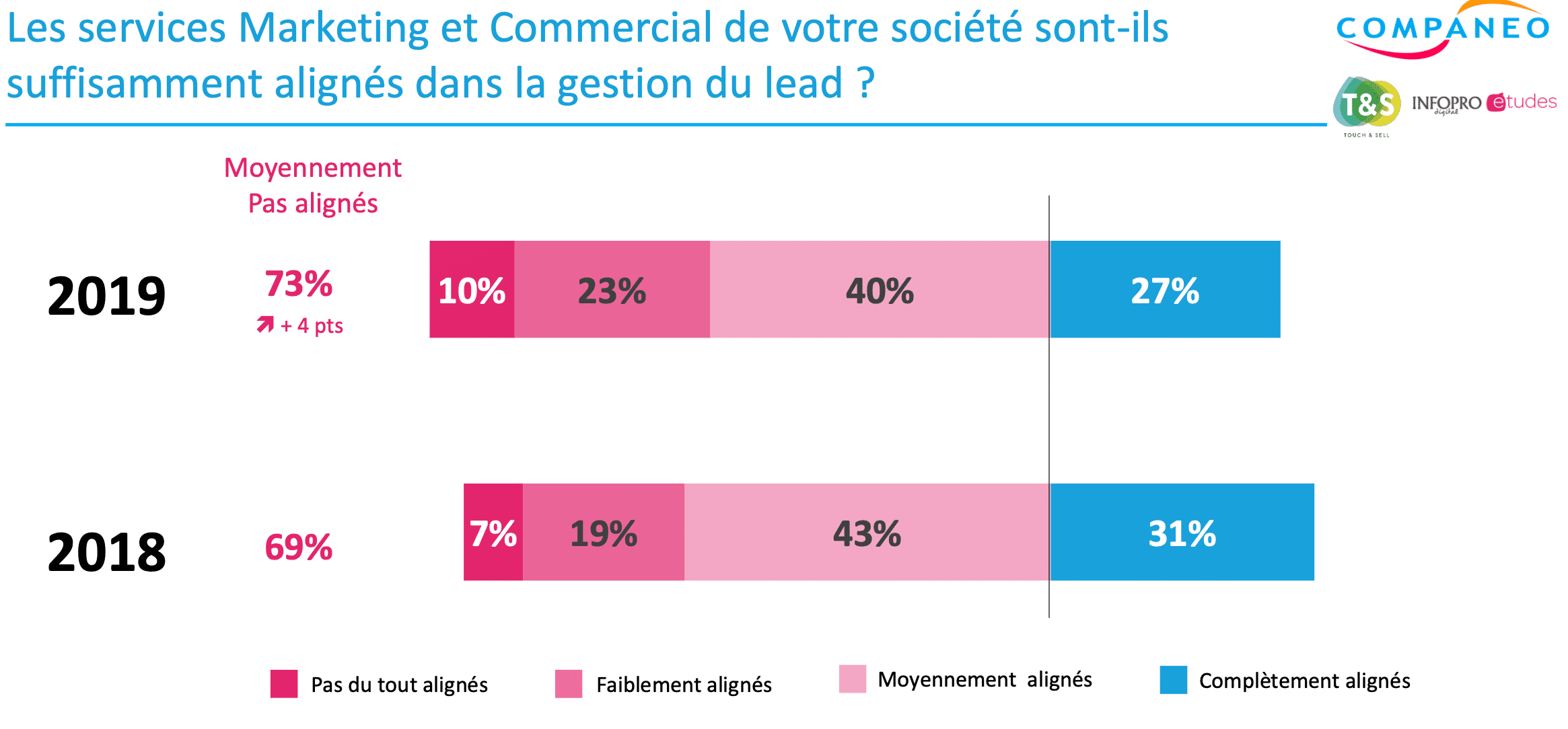 Seulement 27% des répondants estiment que les services marketing et commerciaux de leur société se sont alignés sur la politique de lead generation, c’est encore moins qu’en 2018 ! Dans le détail et comparé aux résultats de 2018, la perception de ce mauvais alignement a augmenté chez les directeurs marketing, directeurs commerciaux et les directions générales. Ces résultats nous dévoilent à la fois une prise de conscience des directions, mais également la difficulté pour les entreprises à rassembler leurs équipes et les faire travailler ensemble autour d’objectif commun.