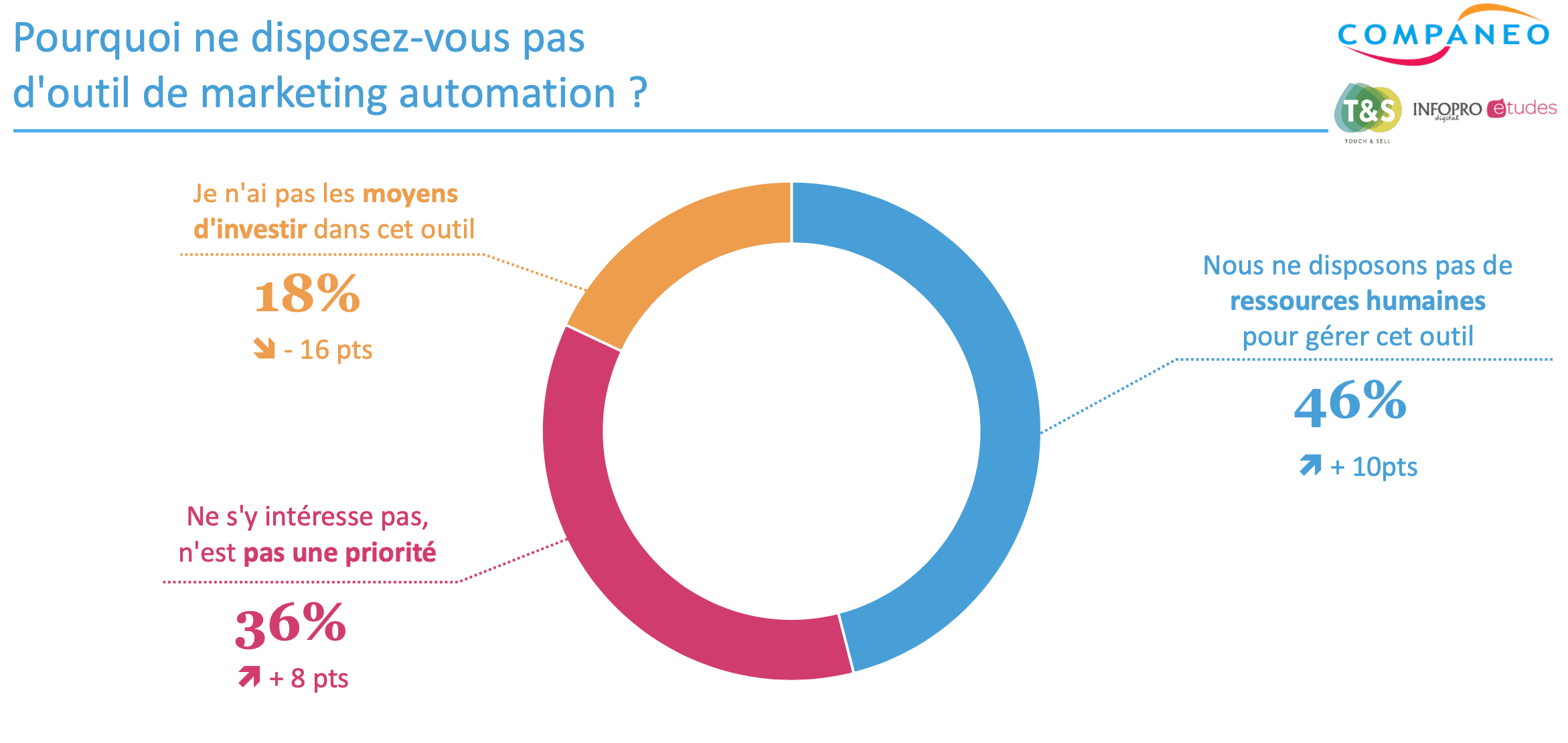 En revanche, si nous prenons l’angle de vue des entreprises qui ne disposent pas d’un outil de marketing automation, nous constatons à nouveau que la problématique principale pour 46% d’entre eux, est un manque de ressources humaines et/ou de compétences pour gérer l’outil.
