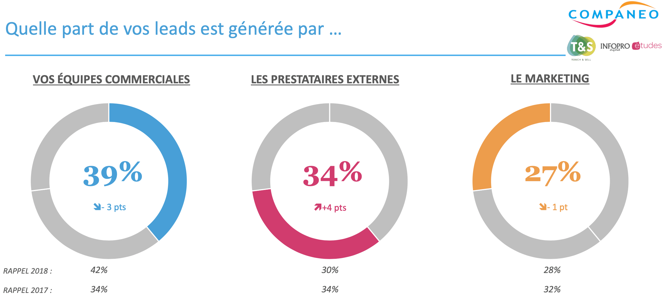 Contrairement aux idées reçues, les leads ne sont pas uniquement générés par le marketing. Au contraire, comme vous pouvez le voir avec les résultats ci-dessous, 39% sont générés par le service commercial, 34% sont générés grâce à des prestataires externes et uniquement 27% sont générés par le marketing. Comme vous le pouvez le remarquer, la répartition des leads générés est plutôt équilibrée, confirmant l’importance pour ces équipes de travailler ensemble afin d’être plus efficaces.