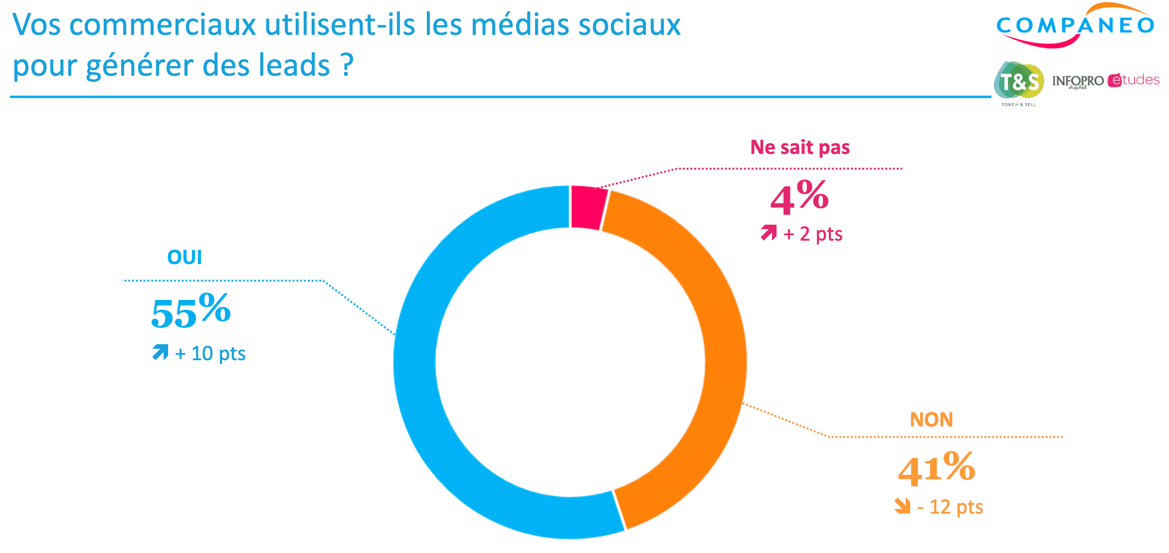 L’utilisation des réseaux sociaux n’est pas non plus réservée au service marketing. En effet, parmi les dirigeants interrogés, 55% d’entre eux utilisent les médias sociaux pour générer des leads. Il faut également noter que par rapport à l’année dernière cette statistique a augmenter de 10 point.