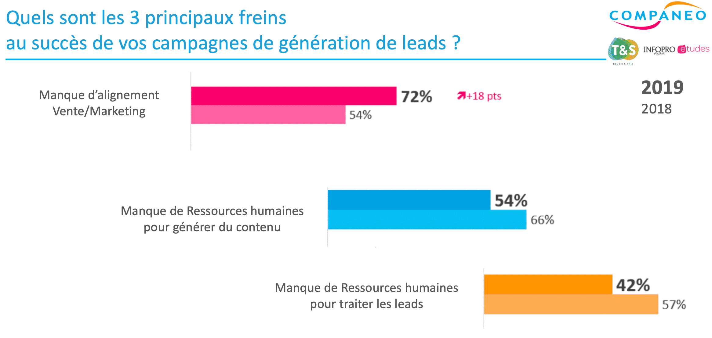 La cohésion entre marketing et commerce est logiquement le principal frein au succès des campagnes (72%). Cependant l’information importante semble être tout autre. 54% des dirigeants interrogés estiment qu’il manque des effectifs et compétences pour gérer le contenu, et 42% estiment que c’est directement l’expertise en lead generation qui manque à leur entreprise. Ces chiffres éloquents sur le manque en ressources humaines et compétences, viennent confirmer les derniers chiffres du rapport Syntec Numérique sur la difficulté chronique de recrutement qui freine la croissance des éditeurs de logiciels.