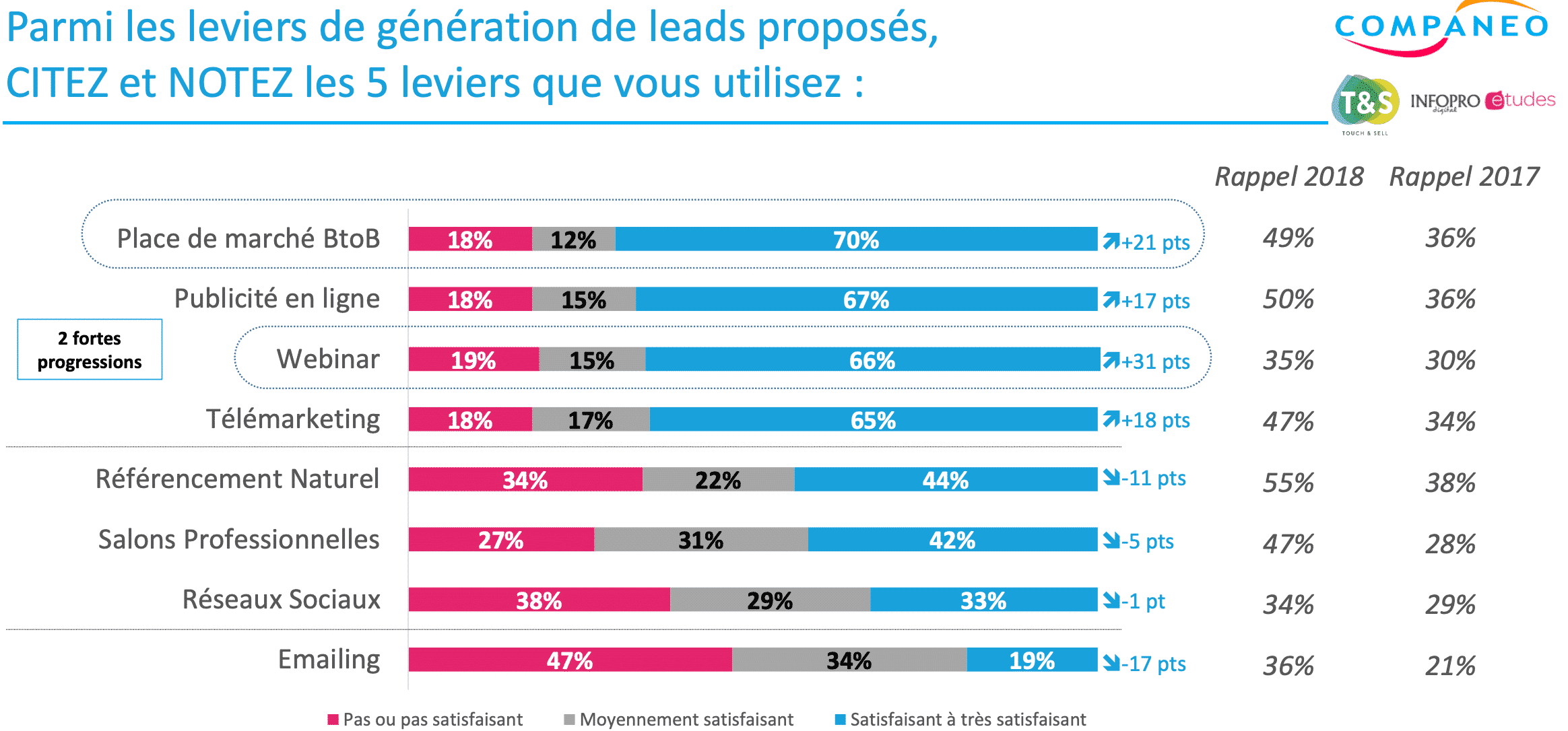 Et pour mettre en place leur politique de génération (et de traitement) de leads, bientôt la moitié (43%) des entreprises se sont équipées d’un logiciel de marketing automation contre seulement 13% en 2017 ! Cela peut notamment s’expliquer par le fait de la multitudes d’acteurs sur le marché, ainsi que la communication très forte sur le marché Français de l’entreprise à l’initiative des théories de l’inbound marketing, Hubspot. Il est bon de noter également que les utilisateurs d’un logiciel de marketing automation sont 2 fois plus satisfaits des résultats qu’il y a deux ans.
