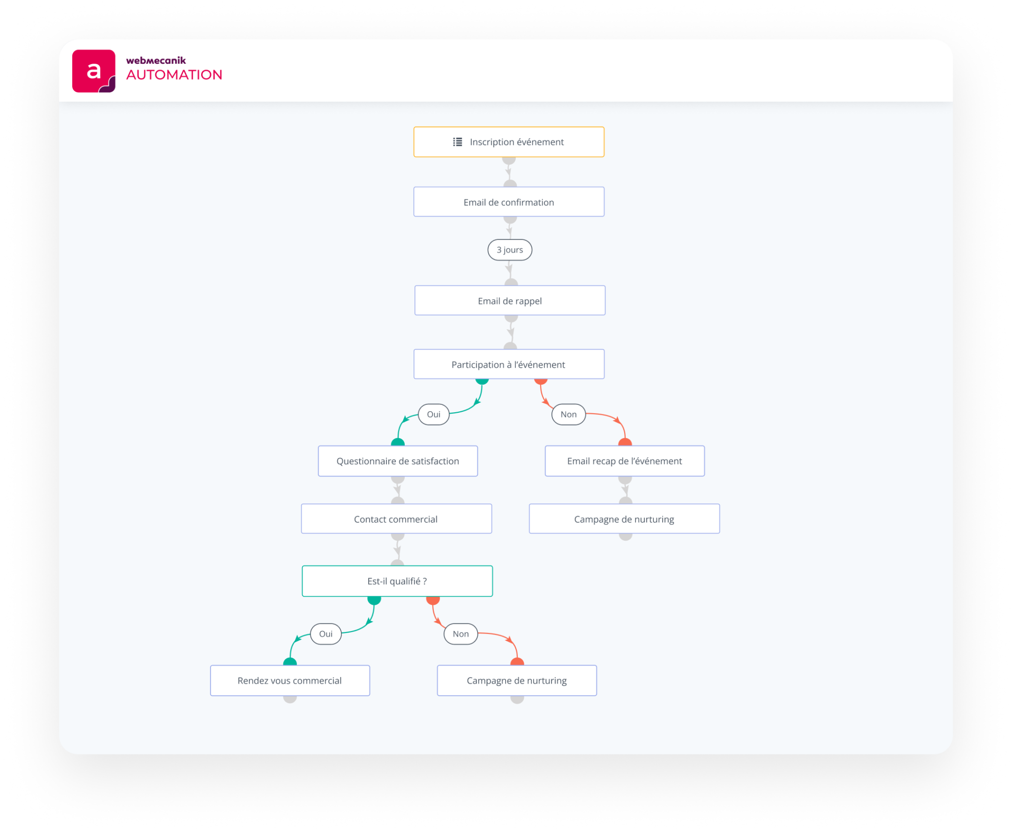 Dès lors qu’un contact s’inscrit à un événement (webinar, salon, etc…), il entre automatiquement dans un workflow événement.