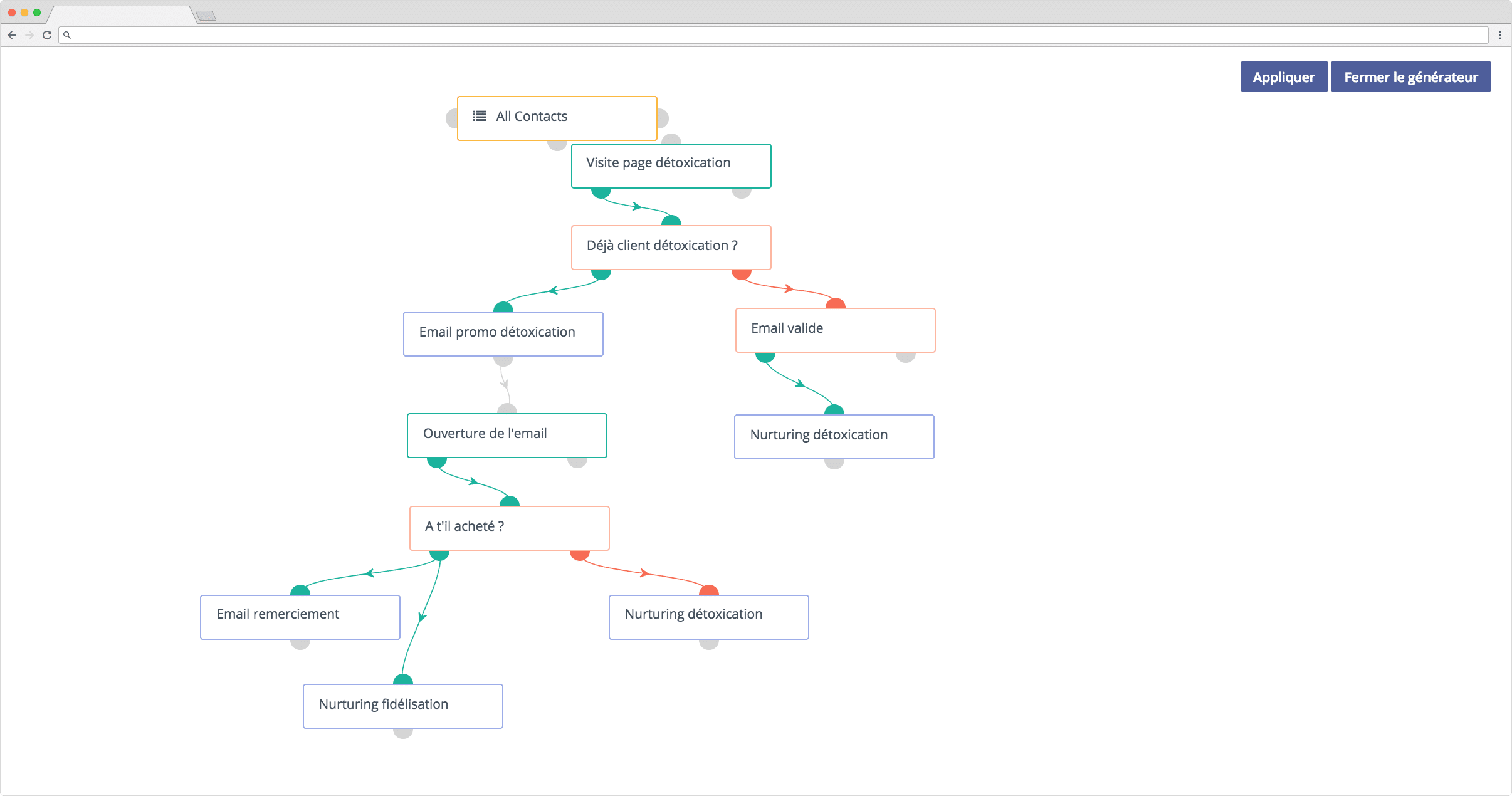 Envoyez le bon message, au bon moment à la bonne personne via des campagnes marketing automatisées. Mettez en place des déclencheurs et des conditions dans vos campagnes marketing via un système très simple de drag & drop.