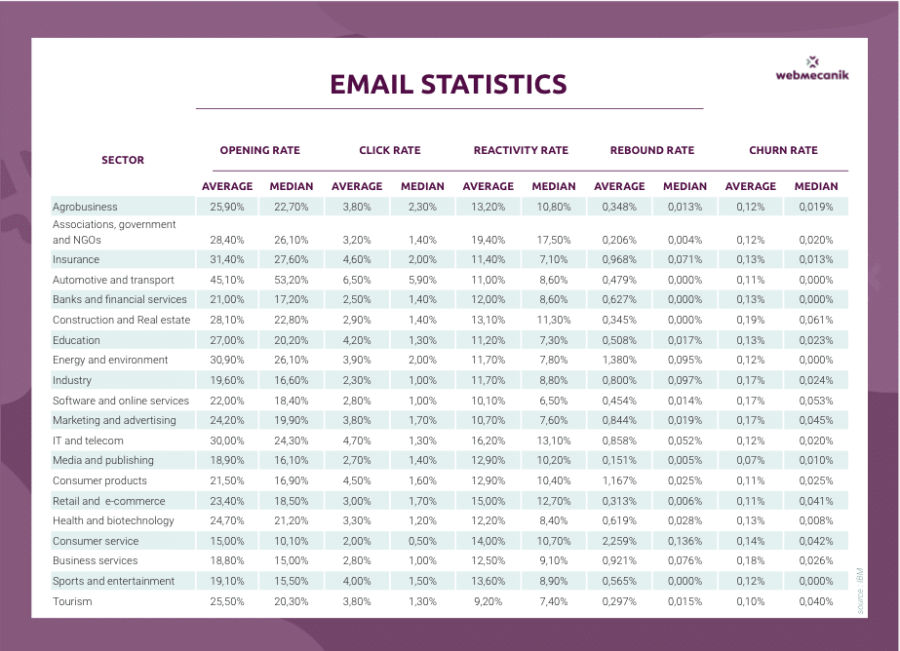 Les statistiques importantes des newsletters sont à surveiller de près. Le taux d’ouverture, le taux de clic, la réactivité, le taux de conversion notamment doivent être analysés après chaque envoi. Le premier correspond aux nombres d’emails qui sont ouverts, il peut être complété par le taux de délivrabilité, qui indique le taux d’emails qui ont bien été reçus. Le taux de clic évalue le nombre de clic à l’intérieur du mail. Le taux de réactivité vient lier le taux d’ouverture et le taux de clic. Enfin, le taux de désinscription évalue le nombre de contacts qui demandent à ne plus être contacté à la suite de ce message. Dans certains cas, le taux de conversion peut aussi être étudié. Pour vous aider voici des chiffres moyens. Attention cependant : les chiffres moyens sont également différents d’un secteur à l’autre.
