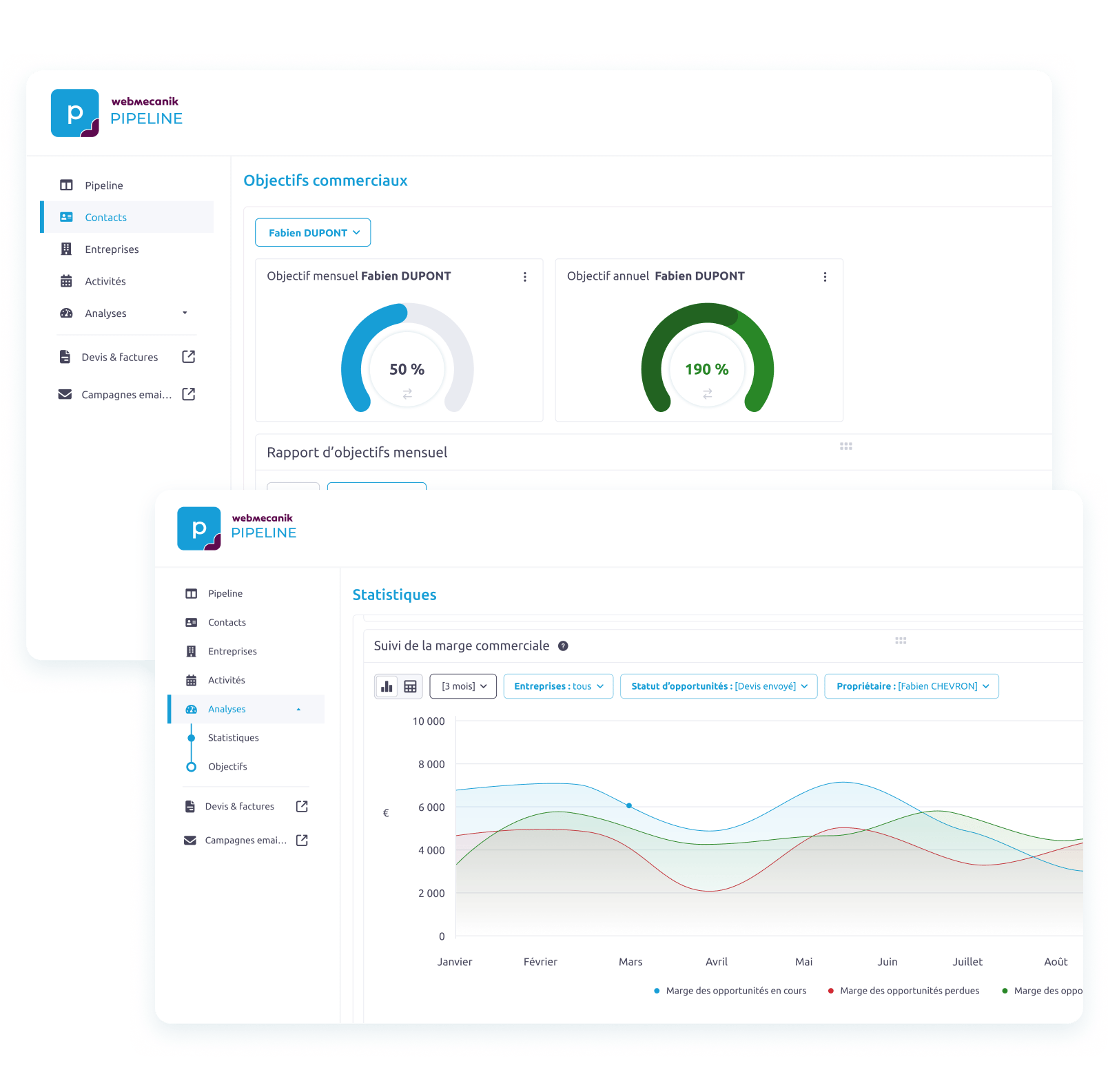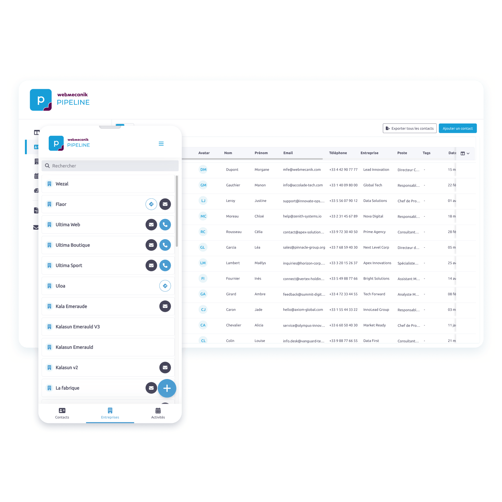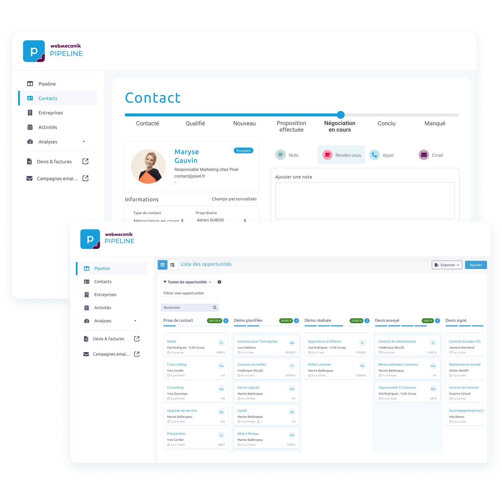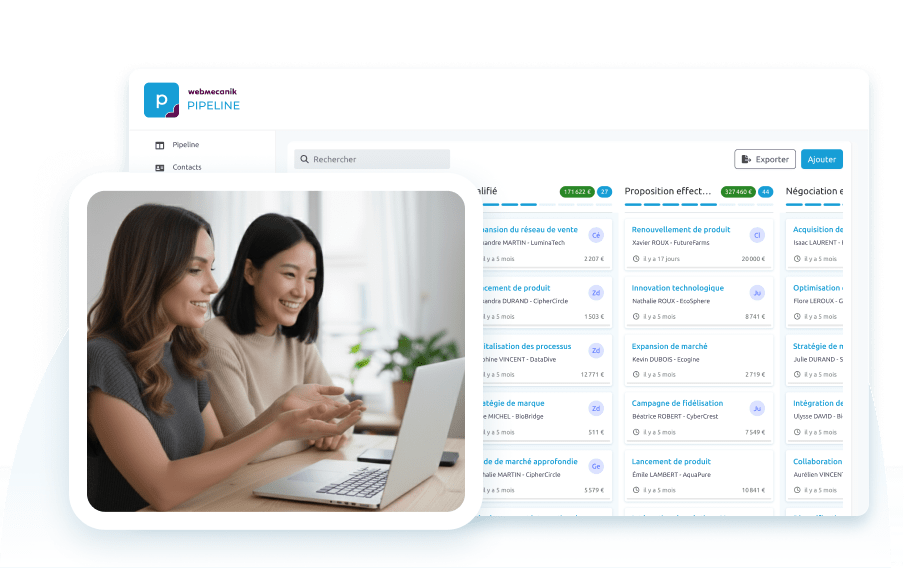 Webmecanik Pipeline, c’est le CRM français qui vous redonne le contrôle de vos ventes. Son interface intuitive et ses fonctionnalités puissantes vous offrent une vue claire de votre pipeline de vente et de chaque action commerciale. Vous vous concentrez enfin sur l’essentiel, conclure vos affaires.