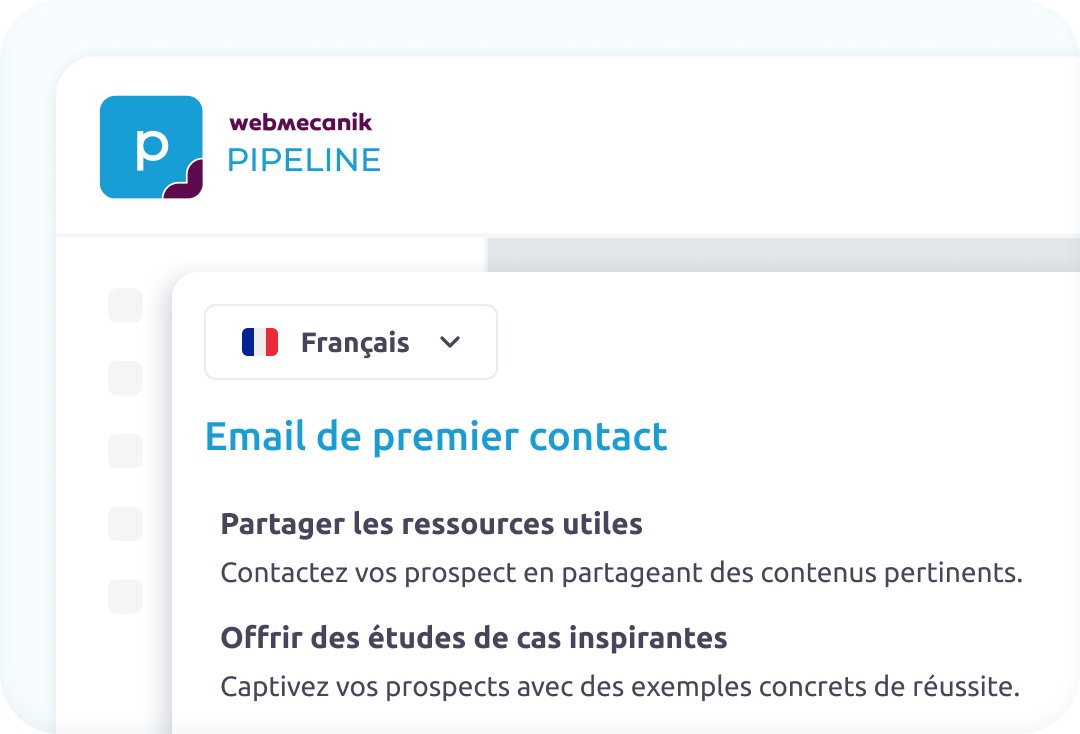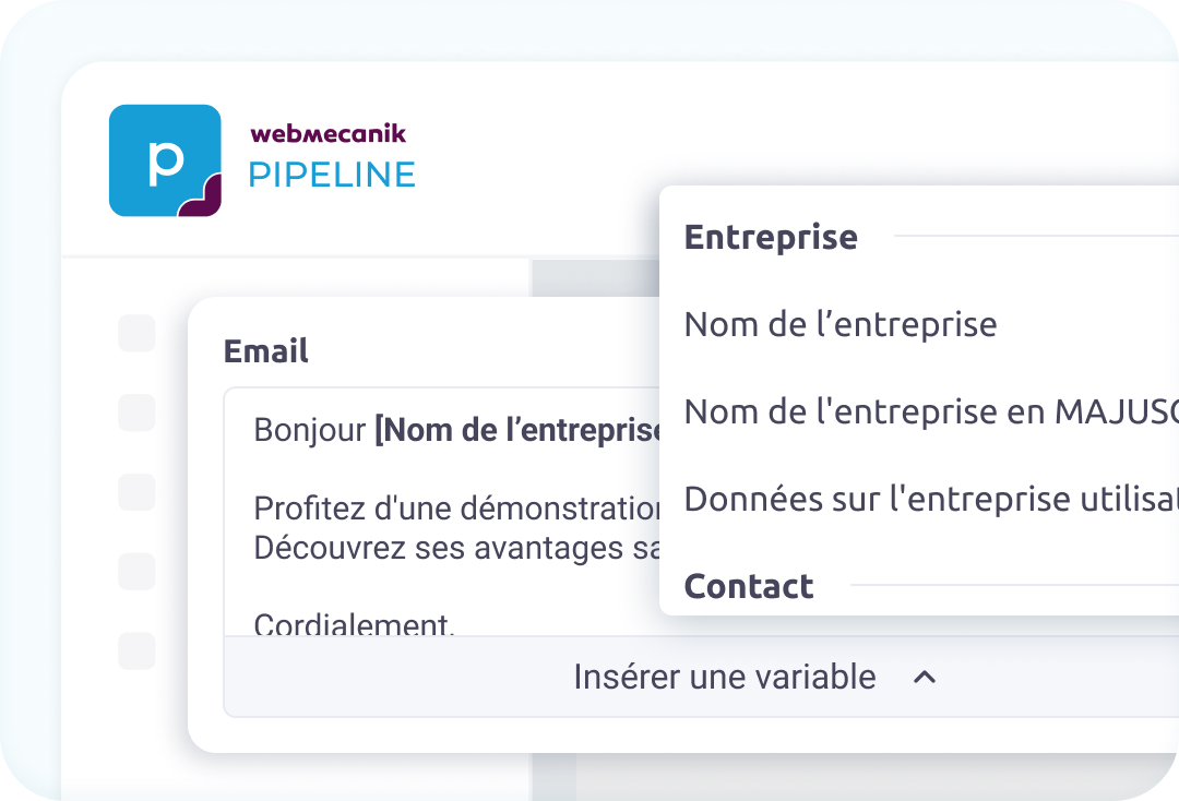 Dans votre CRM Webmecanik Pipeline, nous avons ajouté des modèles d’emails. Cette fonctionnalité est très utile pour automatiser et améliorer vos communications. Elle vous permettra de créer des modèles d’emails personnalisés pour chaque client.