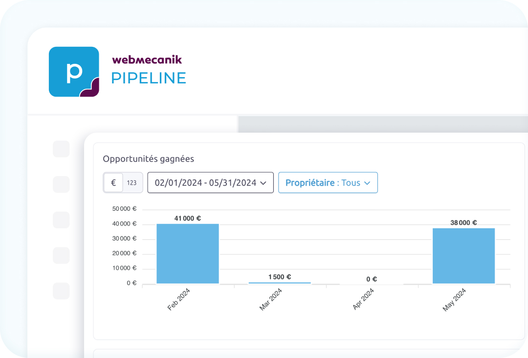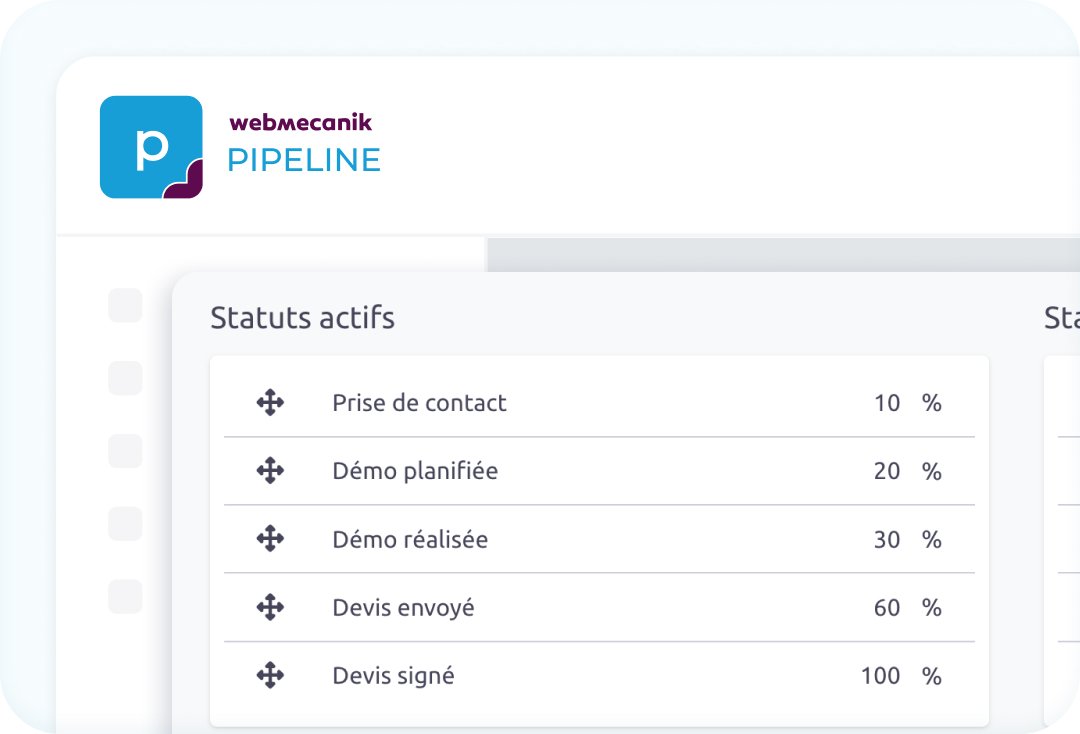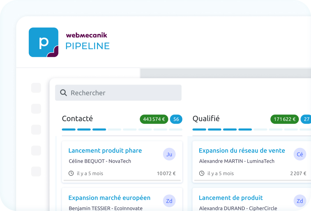 Avec Webmecanik Pipeline, centralisez vos données, suivez toutes vos actions commerciales et ne laissez plus aucune vente vous échapper. Tout en offrant à votre équipe commerciale plus de performance et de sérénité !
